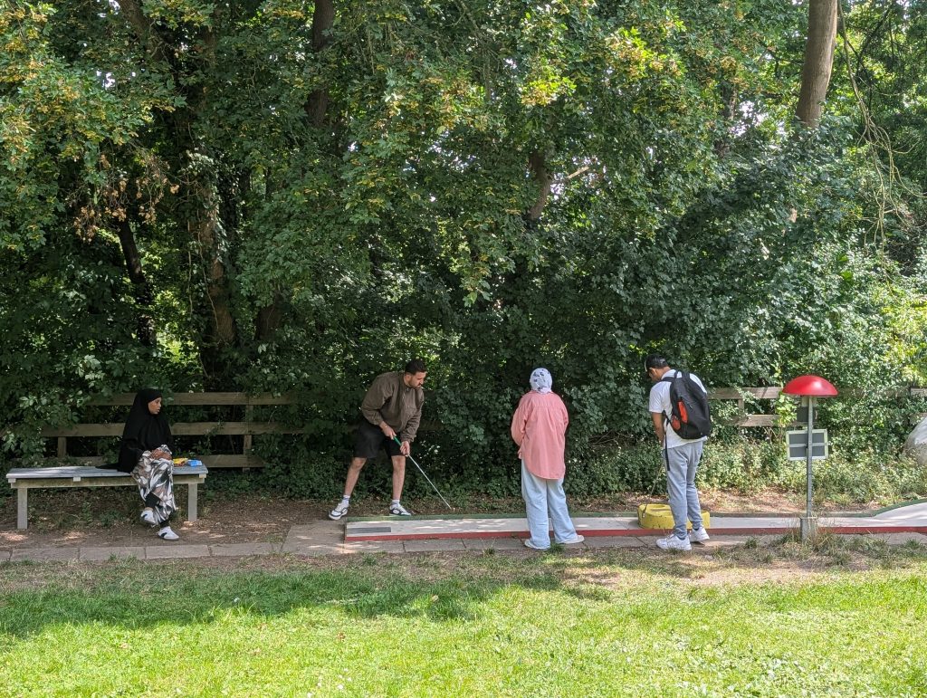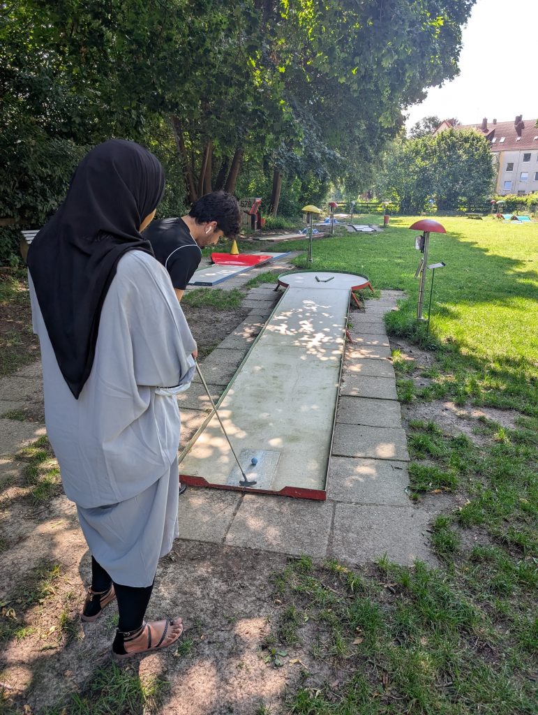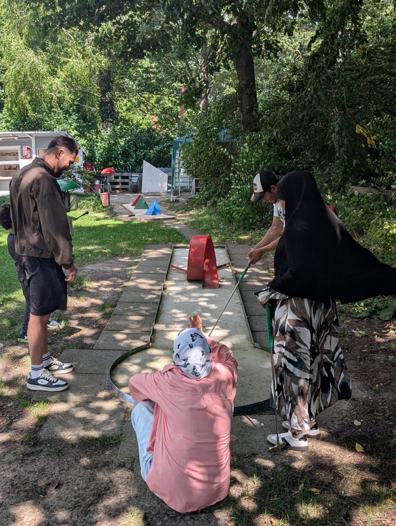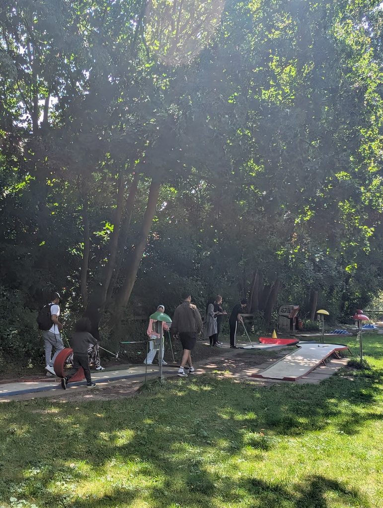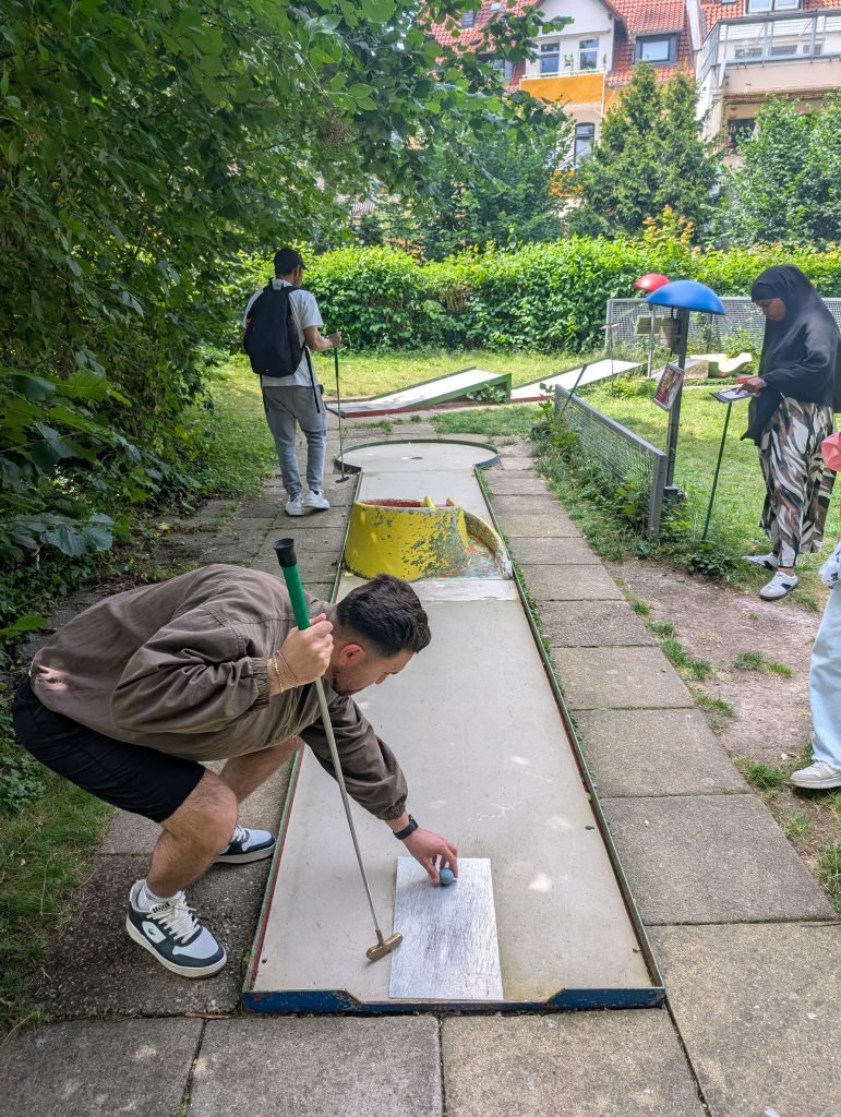 An einem sonnigen Mittwochmittag wurde aus einem normalen Begegnungscafé etwas Besonderes: Ein Ausflug zum Minigolfplatz stand auf dem Programm! Gemeinsam machten sich Bewohnende der Gemeinschaftsunterkunft in der Hildesheimer Nordstadt auf den Weg – mit guter Laune, ein bisschen Neugier und vielen Fragen: Wie funktioniert Minigolf eigentlich? Und wie schwer ist es wirklich, den Ball ins Loch zu treffen?